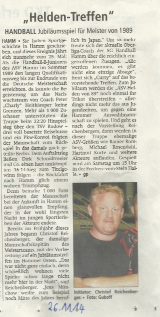 Nach dem Freundschaftsspiel geht es geschlossen zur Bundesliga-Partie des ASV in die benachbarte Westpress Arena. Den Abend werden Dirk Schmidtmeier und Co. dann im VIP-Raum der Sportstätte ausklingen lassen. „Unser damaliger Trainer Peter „Charly“ Heitkämper wird natürlich auch kommen“, freut sich Christof Reichenberger auf das Wiedersehen mit seinen ehemaligen Weggefährten. Wer den langen Qualifikationsweg der Meistermannschaft bis zum Endrundensieg über den TSV Rudow-Berlin noch einmal genau verfolgen will, sollte die Seite im Netz www.asvhelden89.de einmal aufrufen. Dort hat die Mannschaft Fotos, Berichte und Videos zusammengestellt.